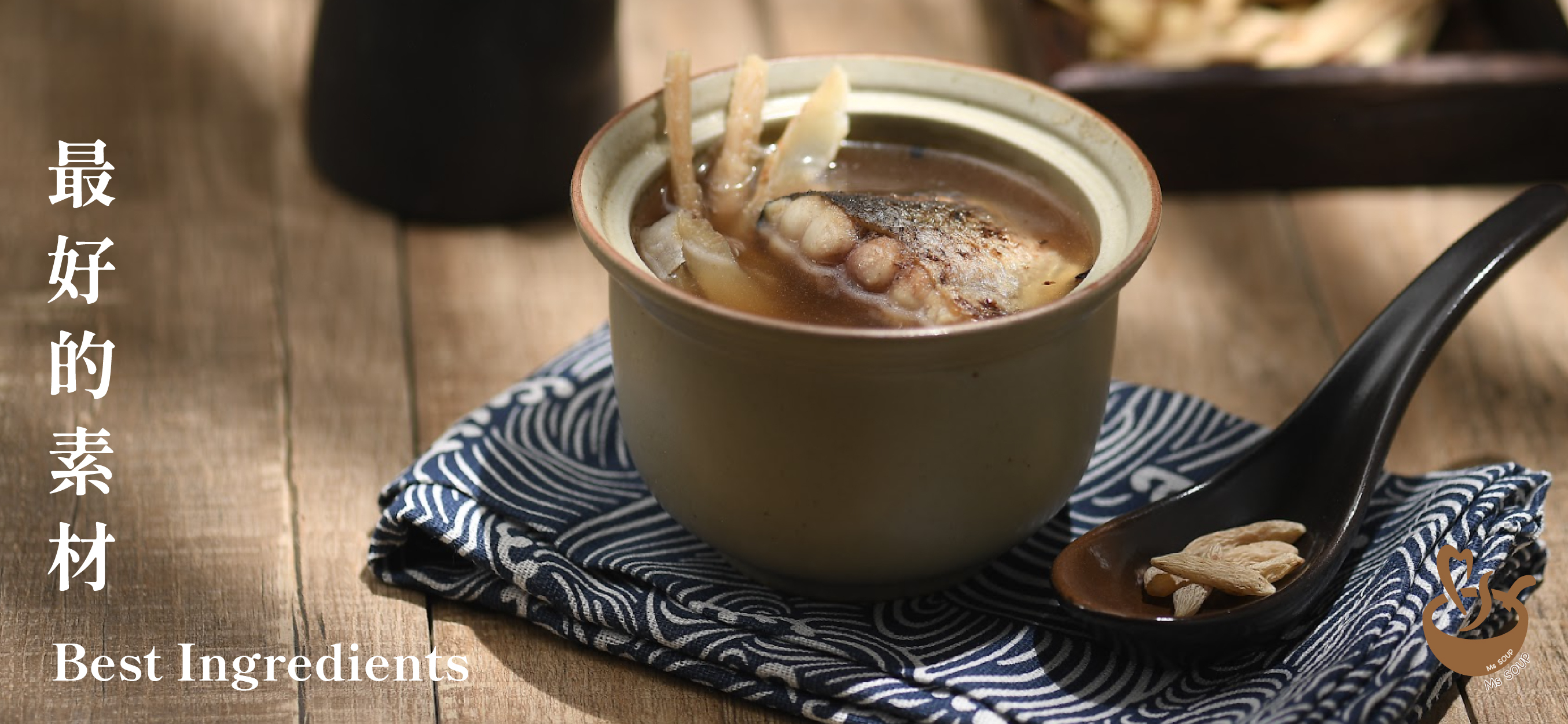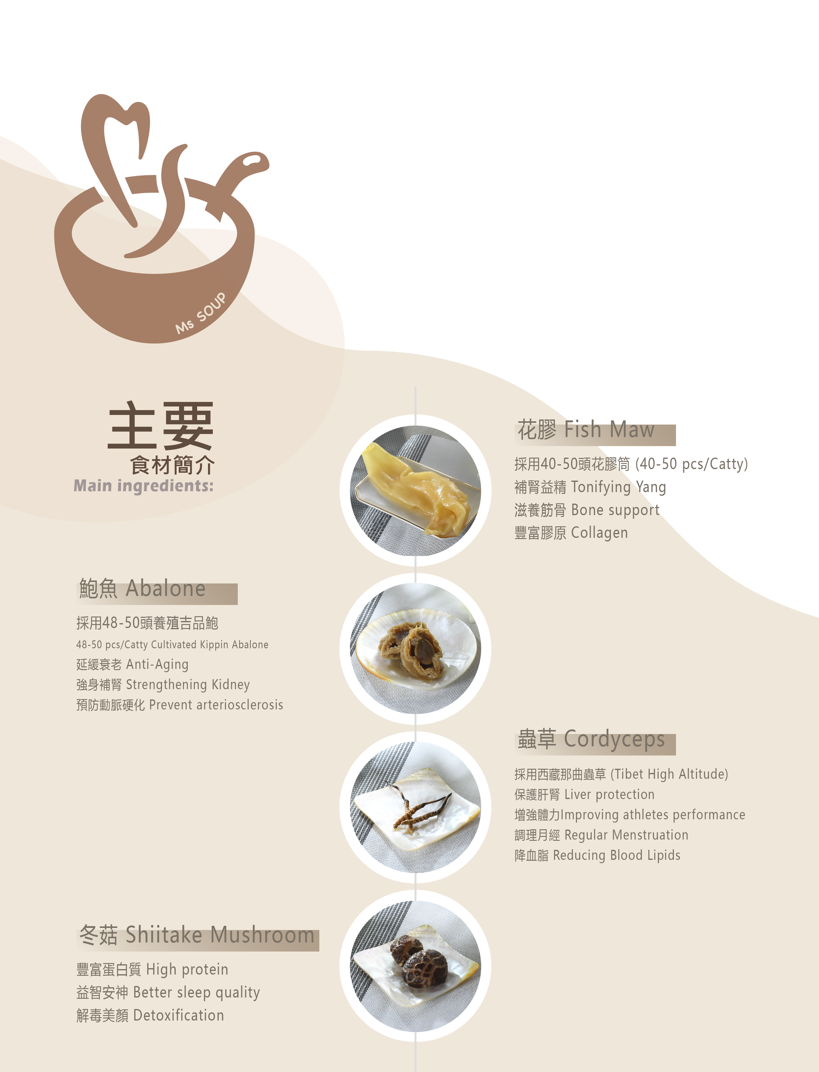 Ms SOUP 一直堅持採用優質本地食材,以四季時鮮,精心製作豐富足料的湯品,致力按四季養生之道,每季推出不同的當季湯品系列,調整身體平衡材料。選購自新鮮及優質的本土農產物,或由本地環保漁農養殖。燉製過程亦將所有食材的營養價值發揮至最大功效。
